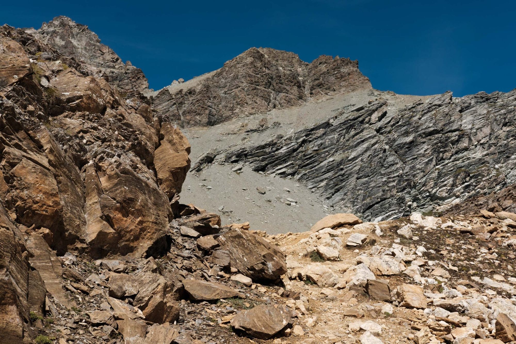 Soon I entered the wasteland of the Triftchumme, filled with rust-coloured scree. This time my attention turned more to the rocky summit of Platthorn directly above than to the more impressive 4,000ers to my left. Platthorn (3,344m) is Mettelhorn’s neighbour. It dominates the walk-in and only upon reaching the little glacier at the top of the combe does Mettelhorn’s final pyramid reveal itself. In 2007, Platthorn had been a snowy peak, but in 2017 it was bare rock baking in the sun. Partly that was due to the time of year, of course. In July 2007 the winter’s snow still lingered, but a long, hot summer had stripped everything back to the bare ice in 2017, leading to very different conditions.