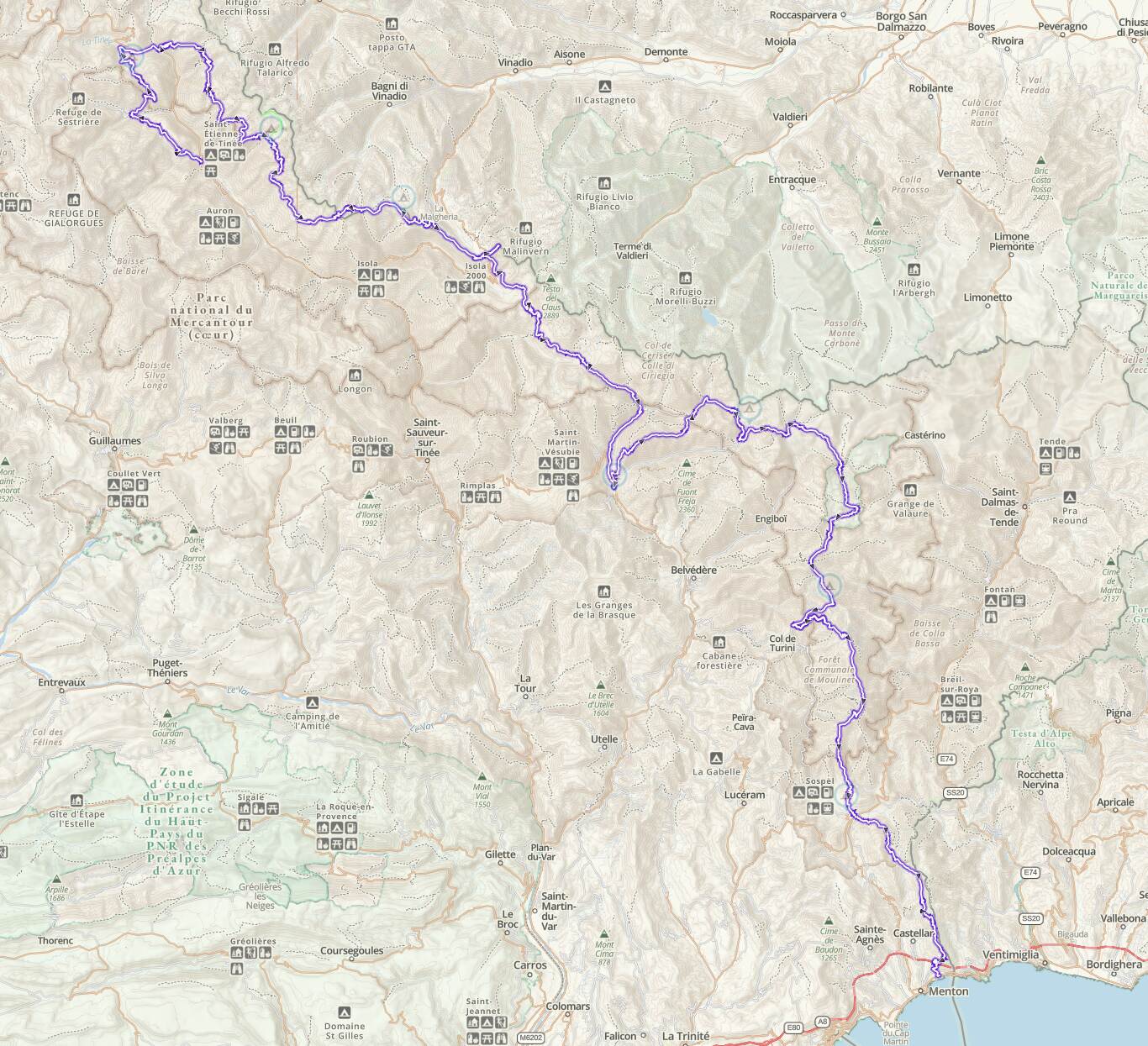 Starting point: Saint-Etienne-de-Tinée, France. The ‘official’ GTM begins at the hamlet of Estenc, but Saint-Etienne-de-Tinée is more accessible; resume the standard route at Saint-Dalmas-le-Selvage.