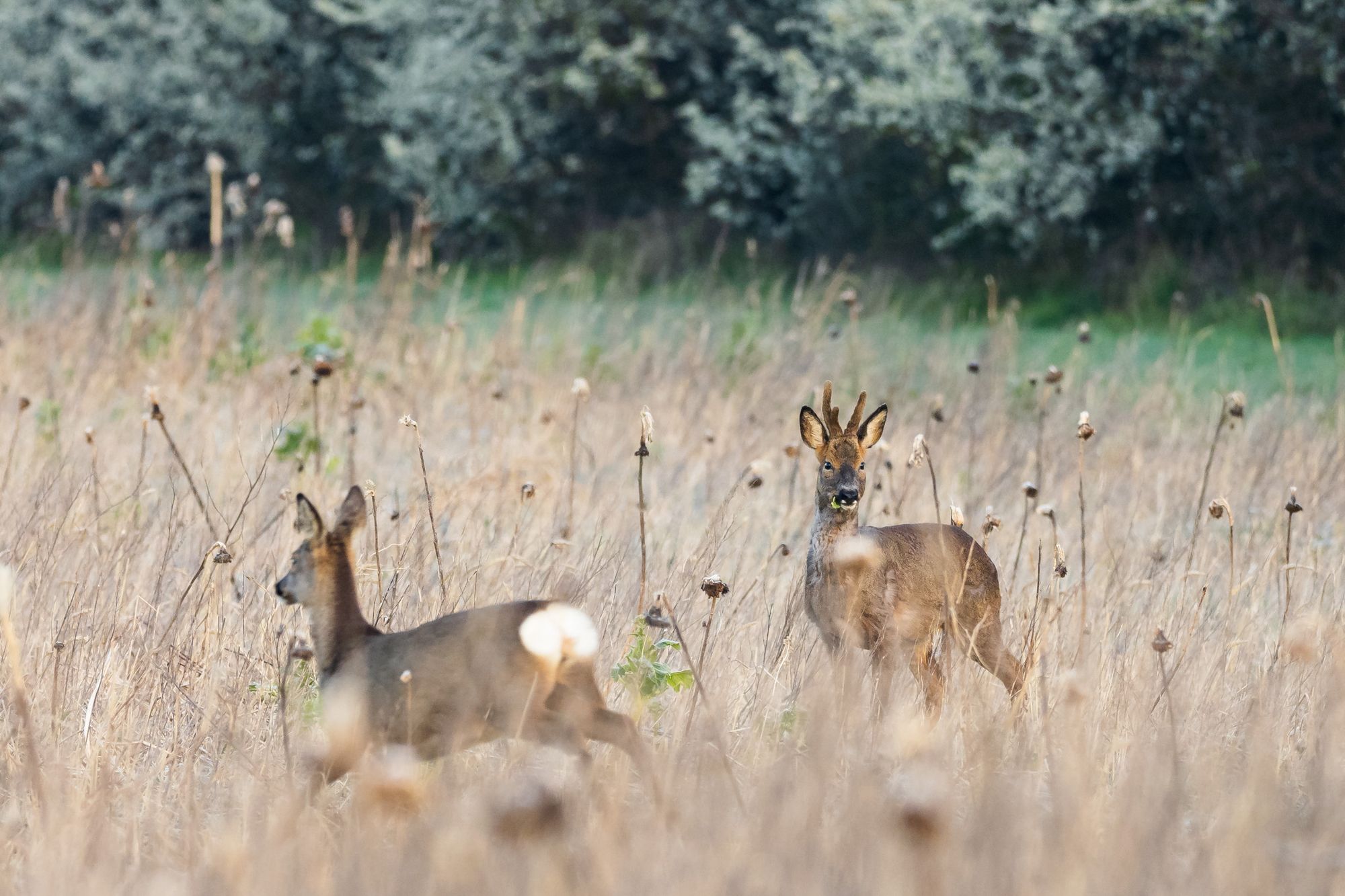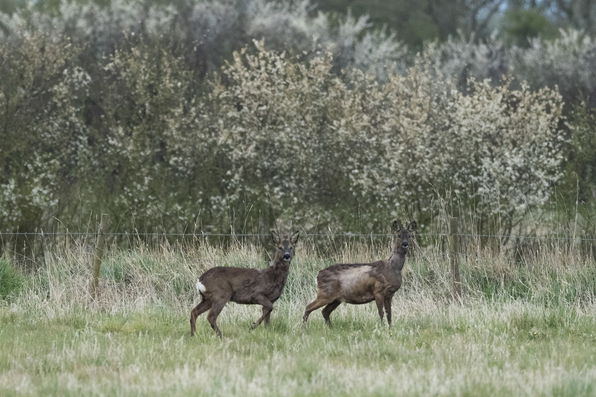 Two different foxes have appeared on my trail cam in the local nature reserve, but I haven’t seen any this month with my own eyes. It’s been all about the roe deer family — I’ve seen ‘Curtis’ (the big buck) several times, and also some of the younger males. I’ve also included here a technically poor record shot of what appears to be a pregnant doe with a buck.