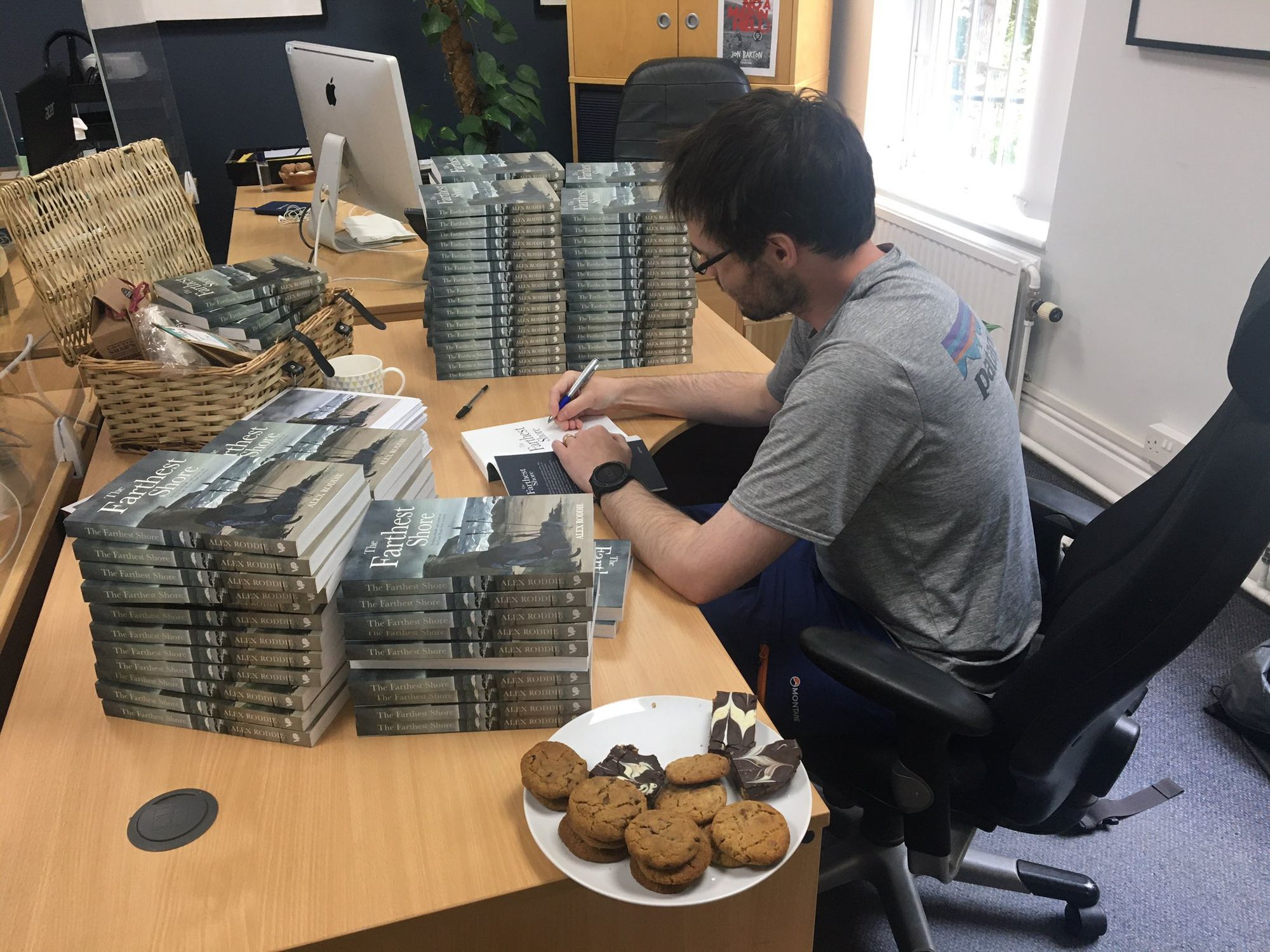 This week, I took the train to Sheffield and paid a visit to Vertebrate Publishing, where I supplied cake and sat down for a few hours with a single task: to sign several hundred copies of my new book The Farthest Shore. I took my own author copies back home with me. Here are a few images of the finished article – and a few thoughts about how I got here.