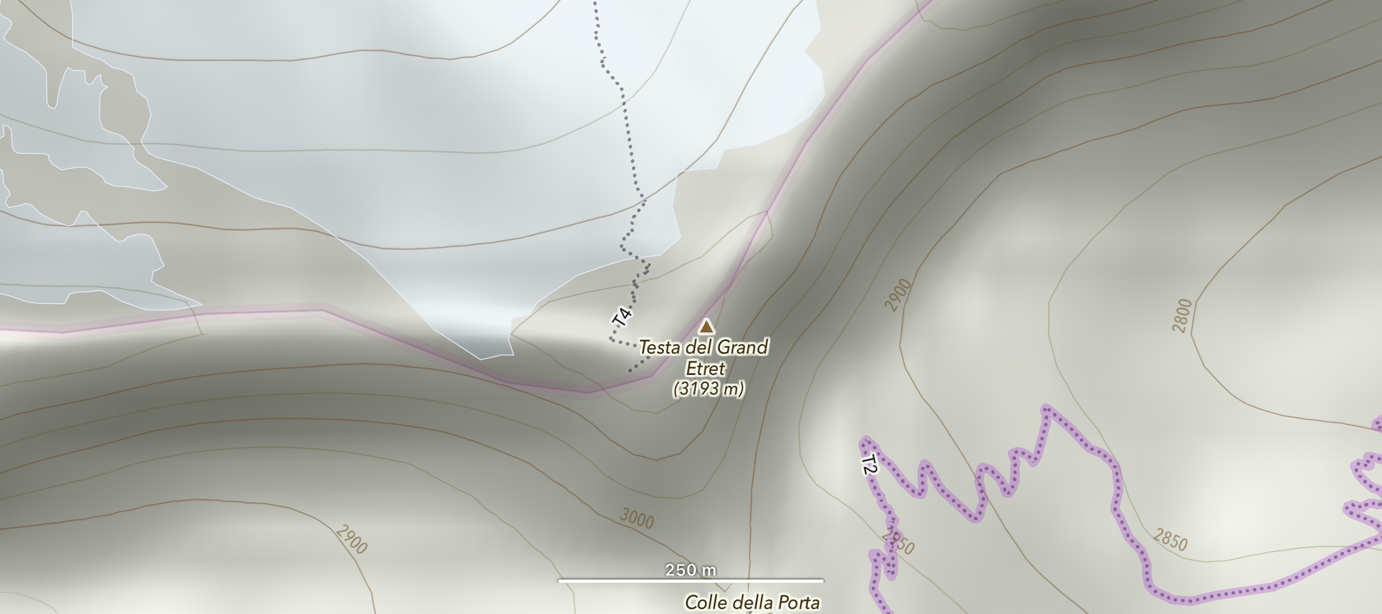 However, there is no quick and easy way to tell how difficult a user-added trail is. Most apps render them as simple dotted or dashed lines – even technical scrambling routes have little or no differentiation. In the Alps, some apps will show a T grade on the route if you zoom in far enough. For example, T3: 'Challenging mountain hiking. A footpath is usually available. Exposed places mostly secured with ropes or chains.' T4 and T5 include difficult scrambling, potentially up to Grade 3 or beyond. However, not every app includes this information (and it isn't obvious even when present). Some apps use more obscure terminology such as 0.1, 0.2, 0.3, which may or may not mean anything to the user (and this text is often tiny, only visible when zoomed a long way in, and there often isn't a map key).