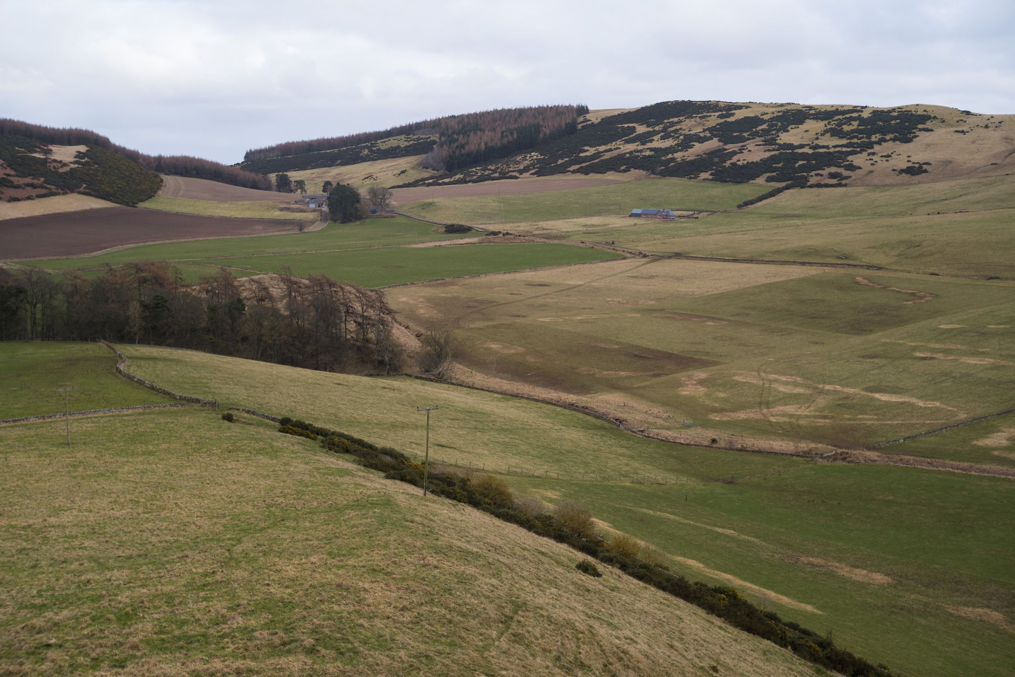 My walk this afternoon took me up into the hills directly south of the house. I wanted to visit Denoon Law, an interesting-looking summit capped by an ancient hill fort, and I wanted to see if I could find a direct route to it over the hills from Eassie. A likely-looking track headed upwards, and I did manage to get all the way to Denoon Law this way, but I had to cross several barbed-wire fences and locked gates. It remains to be seen if there is a better route over these uplands.