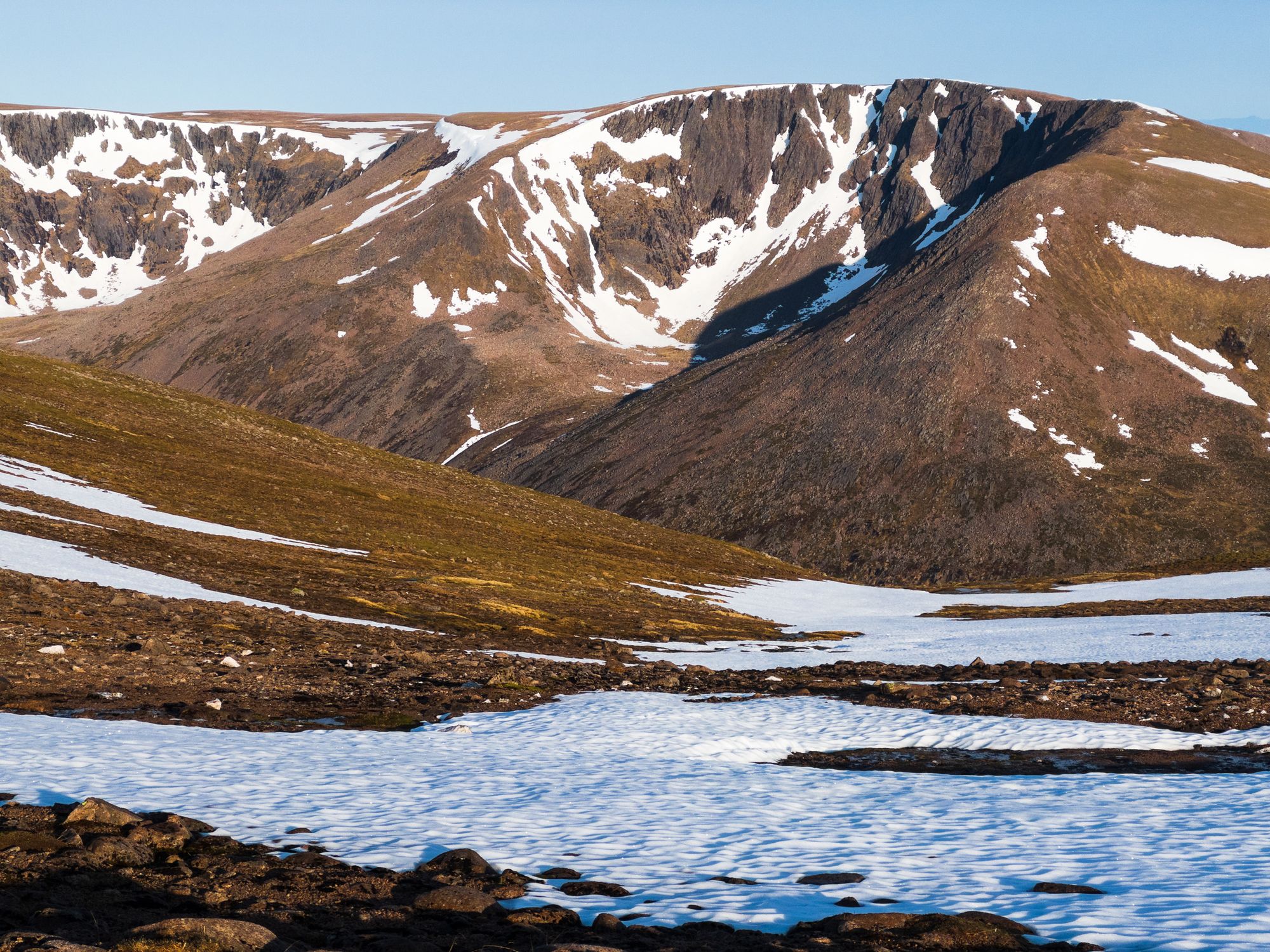 Fog shrouded the ascent to the highest point of the Lairig Ghru, but the forecast said it would burn off by late morning and I kept the faith. It all cleared in the space of about five minutes just past the Pools of Dee, revealing the full grandeur of the big mountains ahead – Cairn Toul looked particularly impressive, as it always does. But there wasn't much snow left for the time of year. Snow patches wreathed the coire headwalls, of course, but I have seen significantly more snow in June.