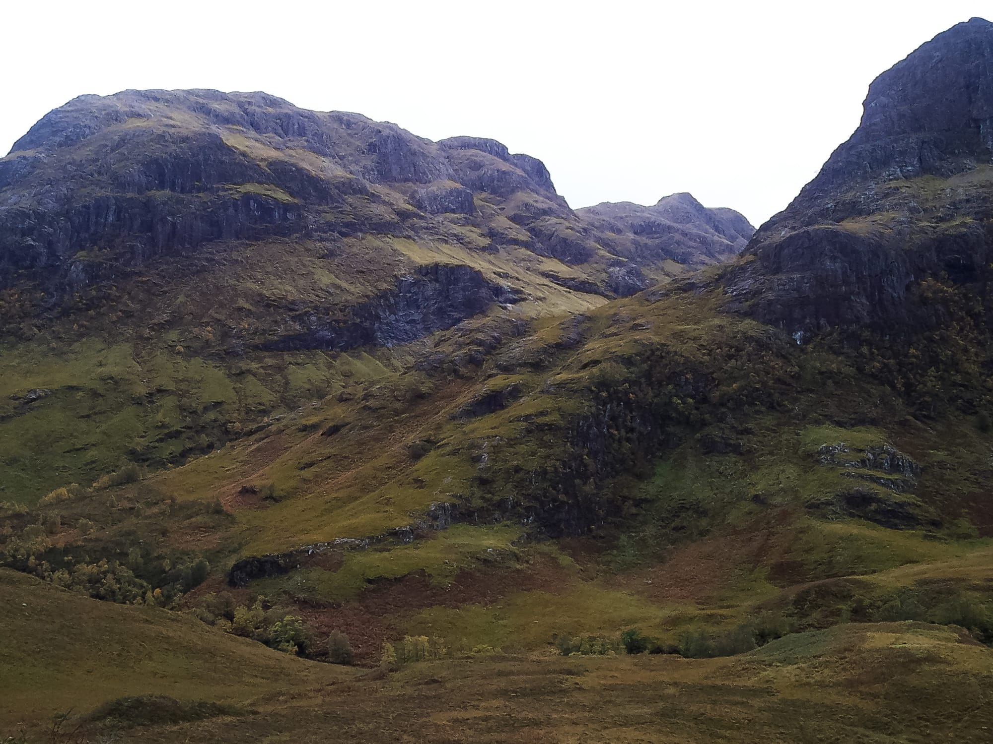Hannah and I drive south through Glen Coe early in the morning. It's quiet. The stags are roaring. The colours on the hill are back to how they should be. We stop at the Coire nan Lochan parking area to get out of the car and gaze up at the heights. I know almost every rock; some have private, special names that only I have written down, recorded only in ink on paper.
