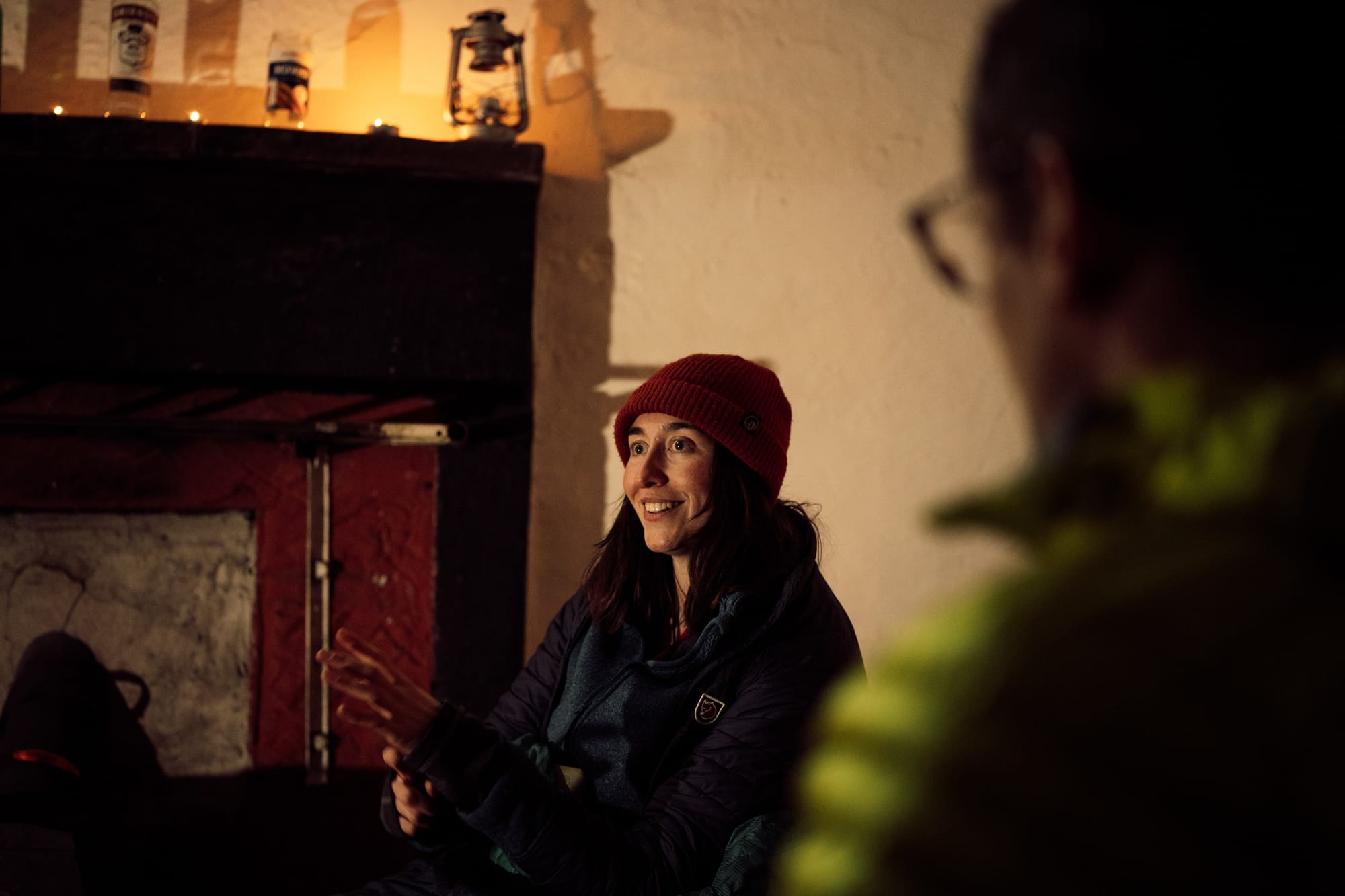 The idea was for a social bothy evening before the craziness of the mountain festival began. So we hiked uphill in the freezing night air, rucksacks laden down with wood to fuel the bothy fire and whisky to fuel the bothy craic. Our headlamps remained off for as long as possible. The switchback trail beneath our feet revealed itself as a glimmering suggestion in the veiled light of moon and stars. Then we hit an engorged ice slick and switched lamps on for safety.