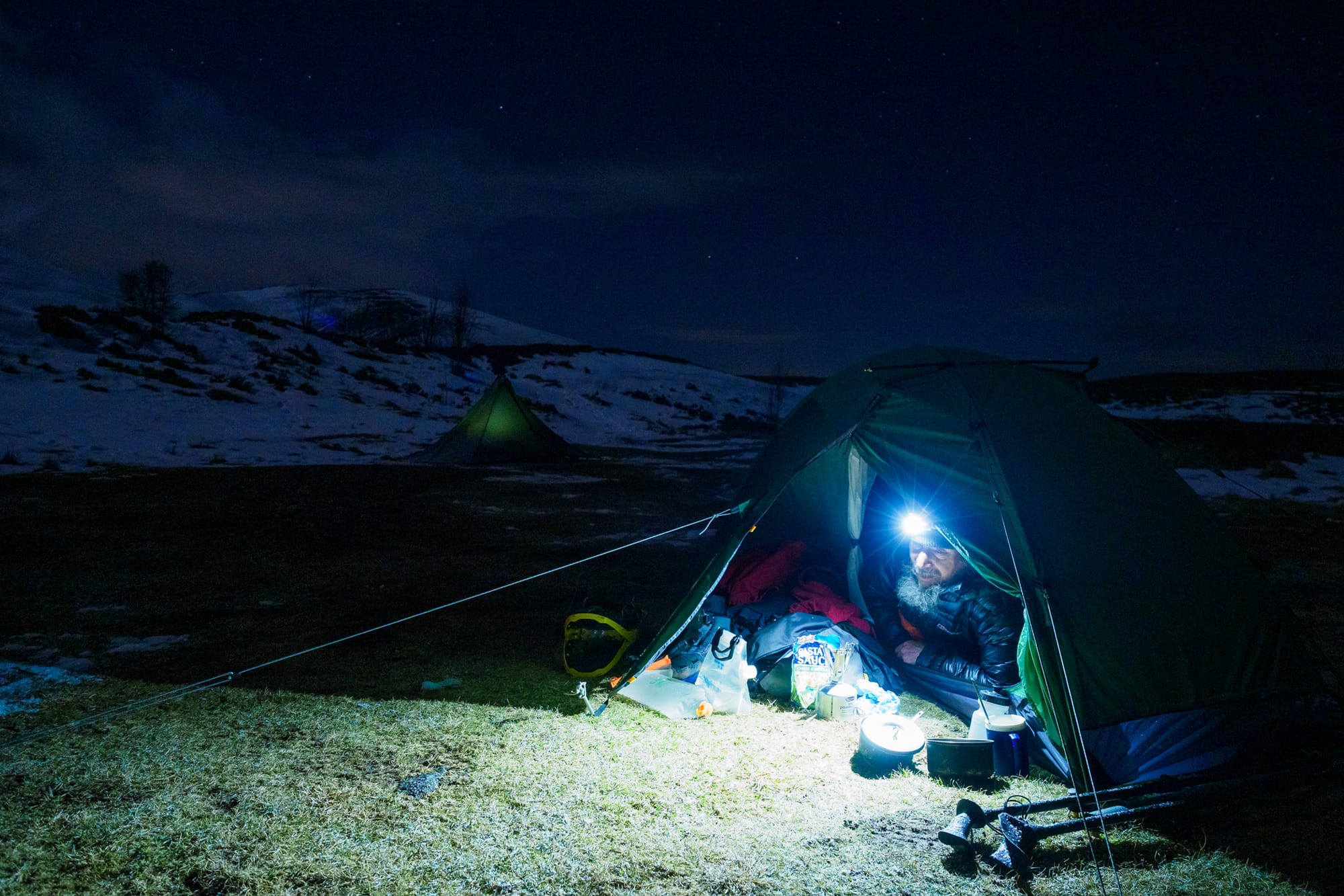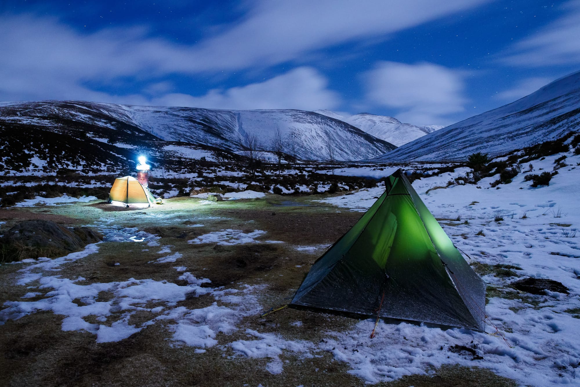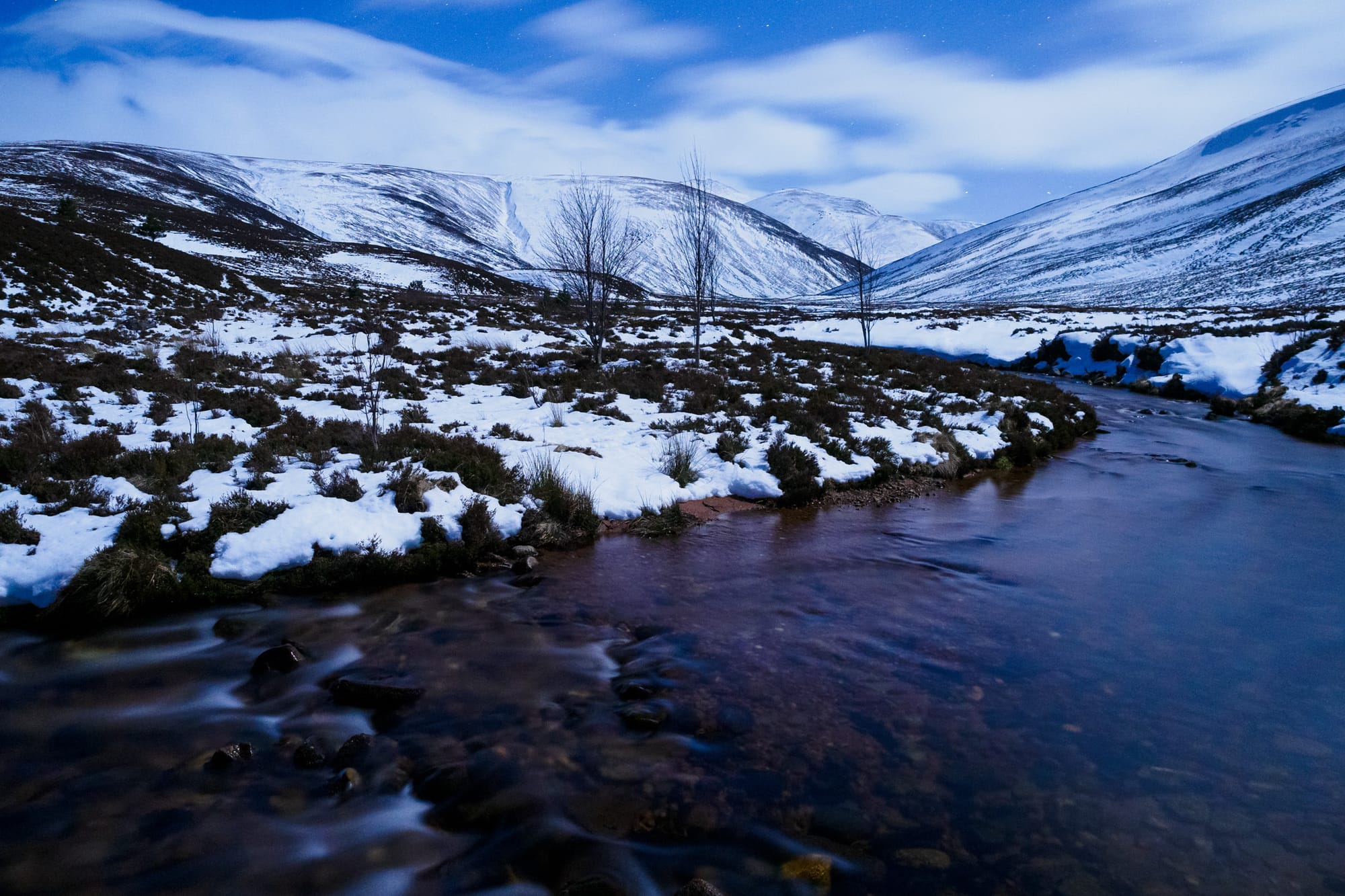 Our camping spot seemed no more than functional at first, but it soon grew on me. Chris and I pitched our tents a few metres apart, choosing pitches with sparser snow cover than the rapidly refreezing blanket coating the heather on all sides. More snow had come down as we were setting up camp and I assumed it would be an evening sealed up inside silnylon and down, listening to the patter of snowflakes on the flysheet. But when I pulled on boots to collect water I found that the sky had cleared and moonlight streamed down on a landscape of breathtaking beauty and softness. We spent a while looking at the stars, and gazing up at the brow of the mountain we planned to climb the next day, and watching the water flow past quiet and deep in the river below: simple things, yet precious beyond price.