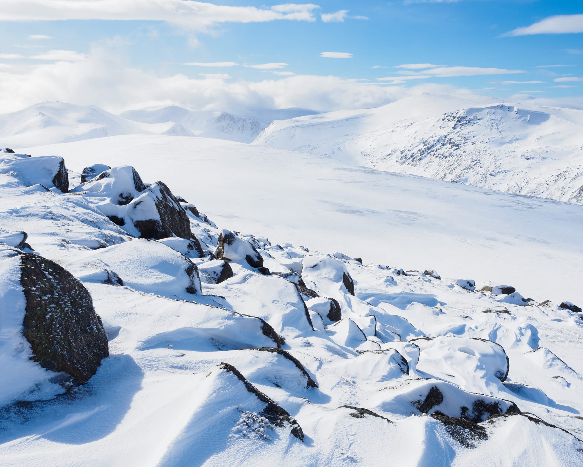 Bynack More’s summit, a calm and sunny perch above endless snows, was so different to the roaring maelstrom I’d experienced last time that it felt like a different place entirely. I tried to remember when I’d last seen winter conditions this perfect. Four years ago, maybe? Considered in the context of my entire lifespan, just how rare, how special, were these experiences – and did I always appreciate them as I should? I looked on to the cloud-wreathed basin of frozen Loch A’an, an abyss clenched between crags piled high with snow, and felt excitement rising within me at the journey yet to come. This, I thought, is living.