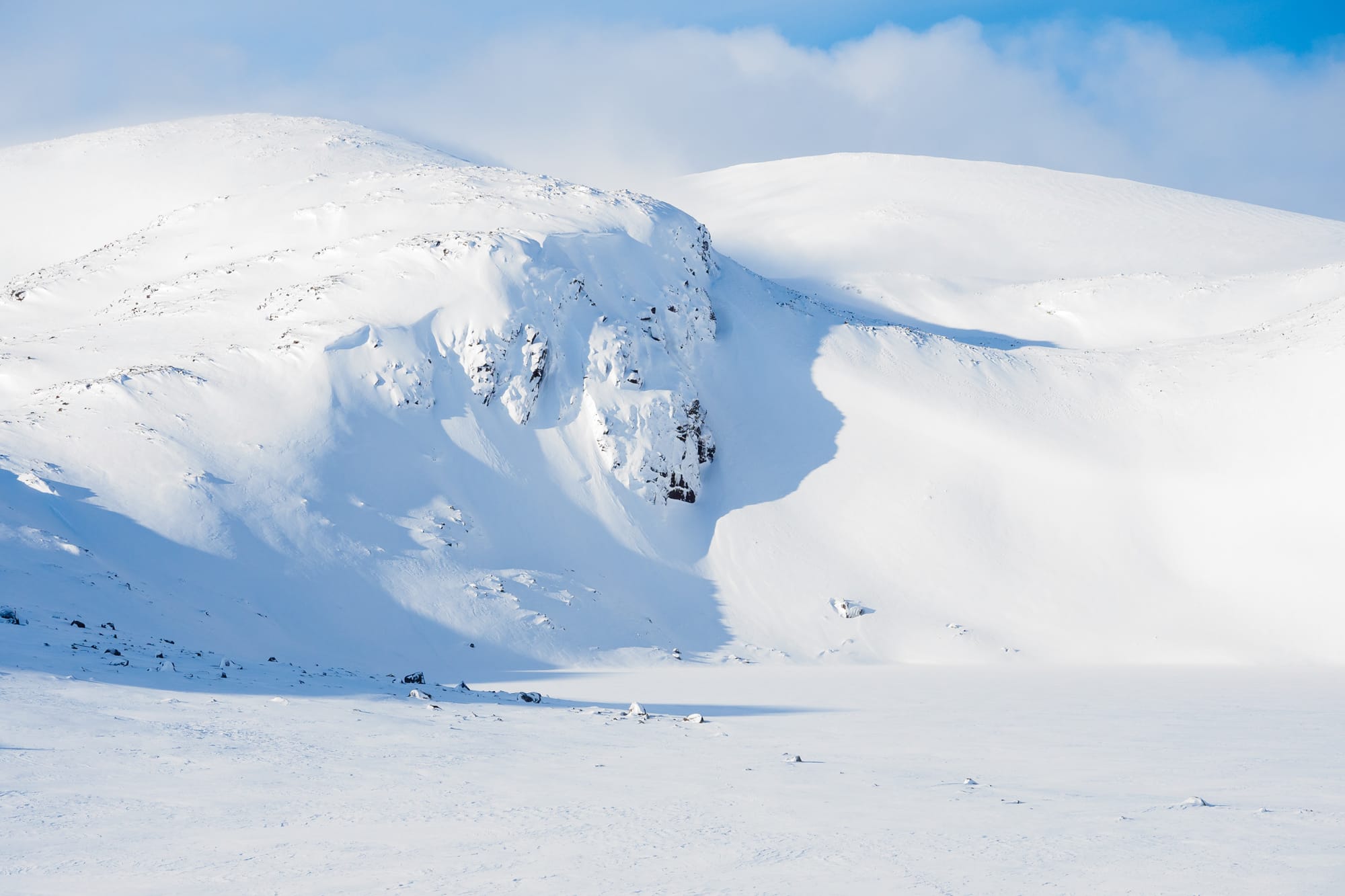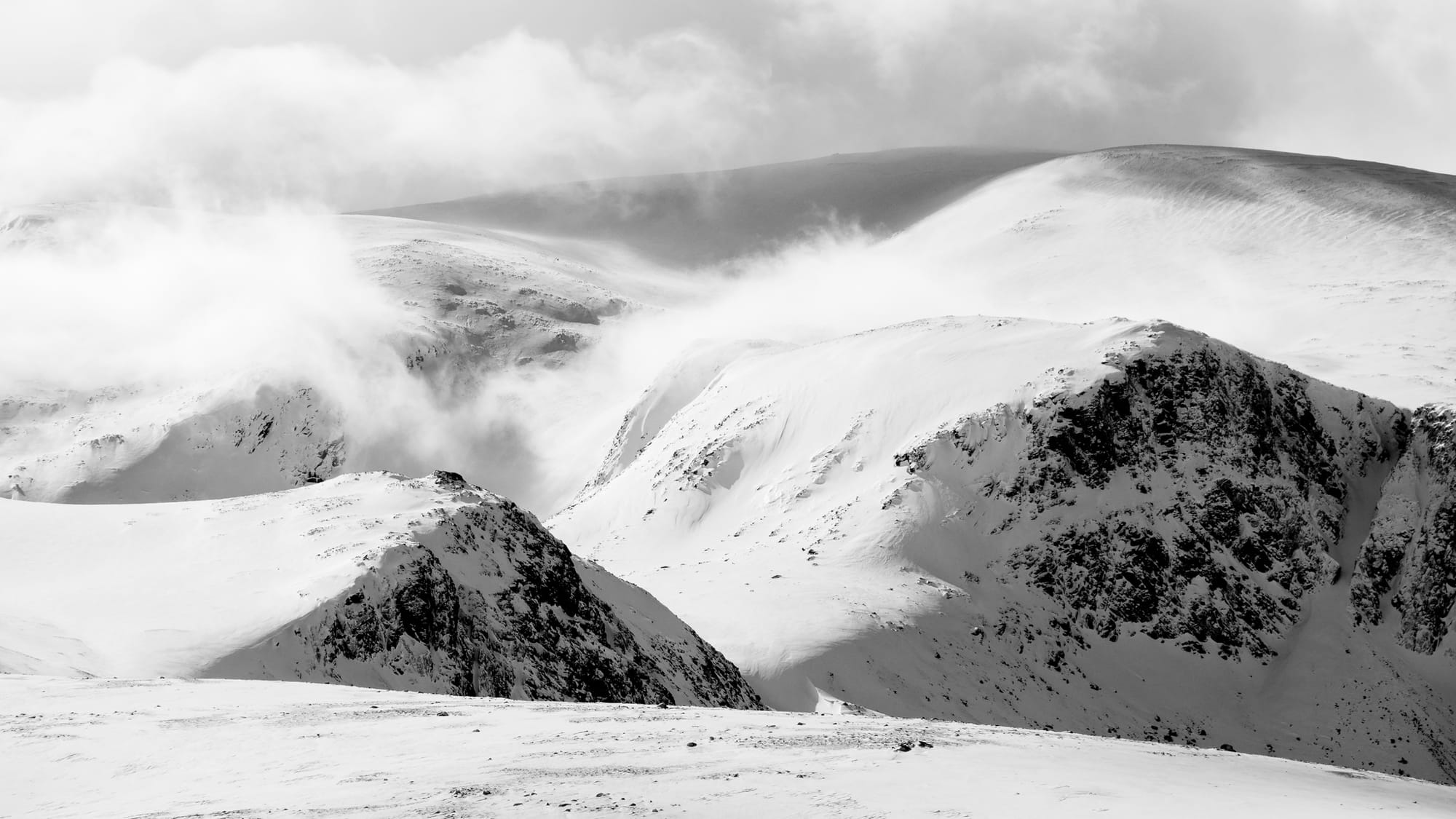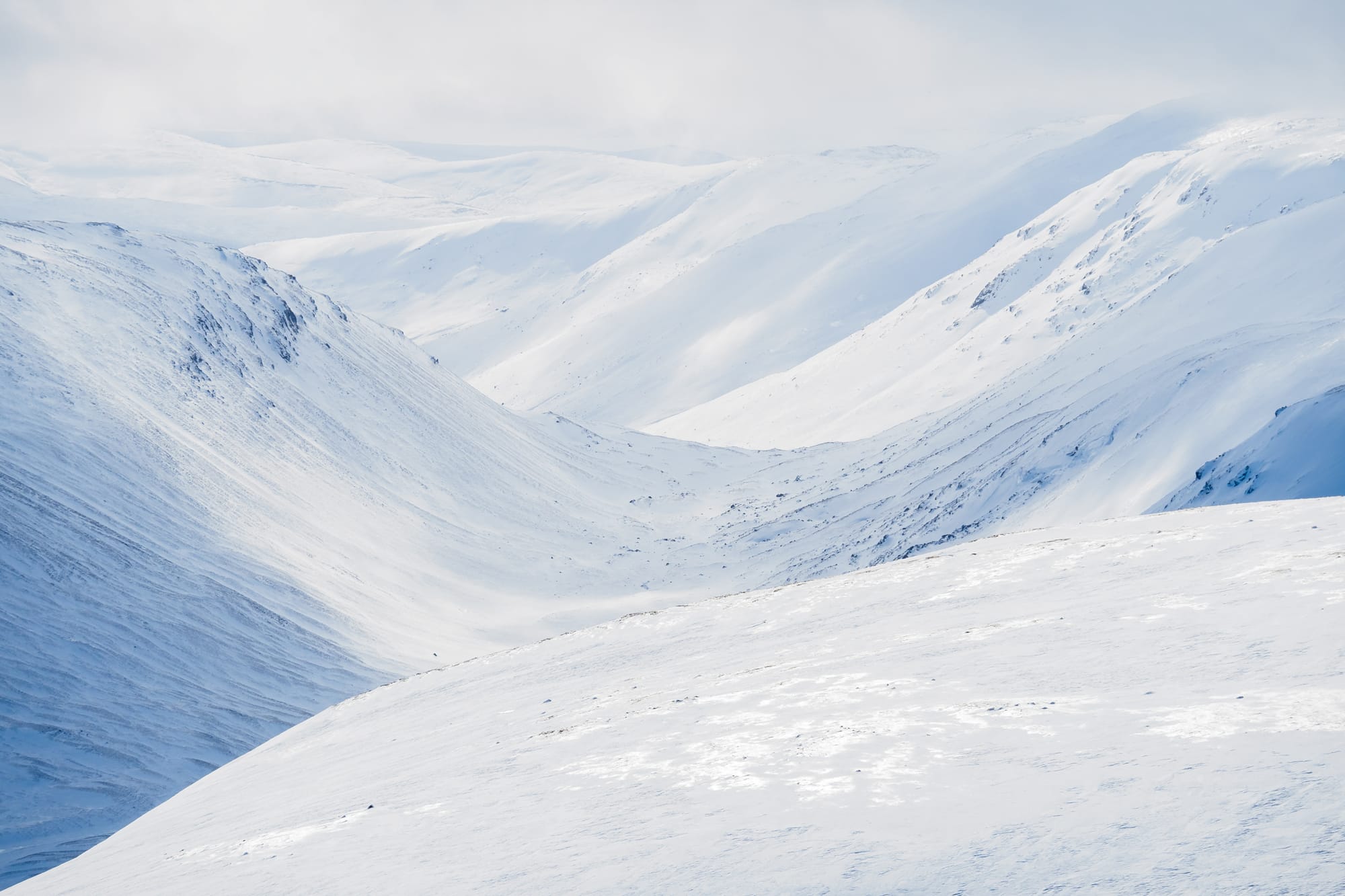 I climbed past Loch Etchachan, buried and choked beneath an exceptional depth of snow, and made tracks up the ridge towards Ben Macdui in a rising wind and swirl of spindrift curling away from the crest. Suddenly the cold really began to bite and I struggled with my jacket as I added a layer on underneath. Ben Macdui’s summit was in the white room: a disorienting whiteout with no up or down until the wind tore a hole in the cloud and revealed a glimpse of some distant sunlit view. With an eye on my compass I navigated away from the summit, and soon started meeting other people again. A pair of young ski tourers said hello. A hillwalker wheezing at the effort of the soft snow said he wished he had my snowshoes. Back on the main track, which was easy to follow now despite the spindrift that had covered it in places, I soon dropped below the cloud base and romped down easy slopes beside Coire an Lochain, where I spotted a tent in a fine location behind a wall of snow someone had built to shield it from the wind.