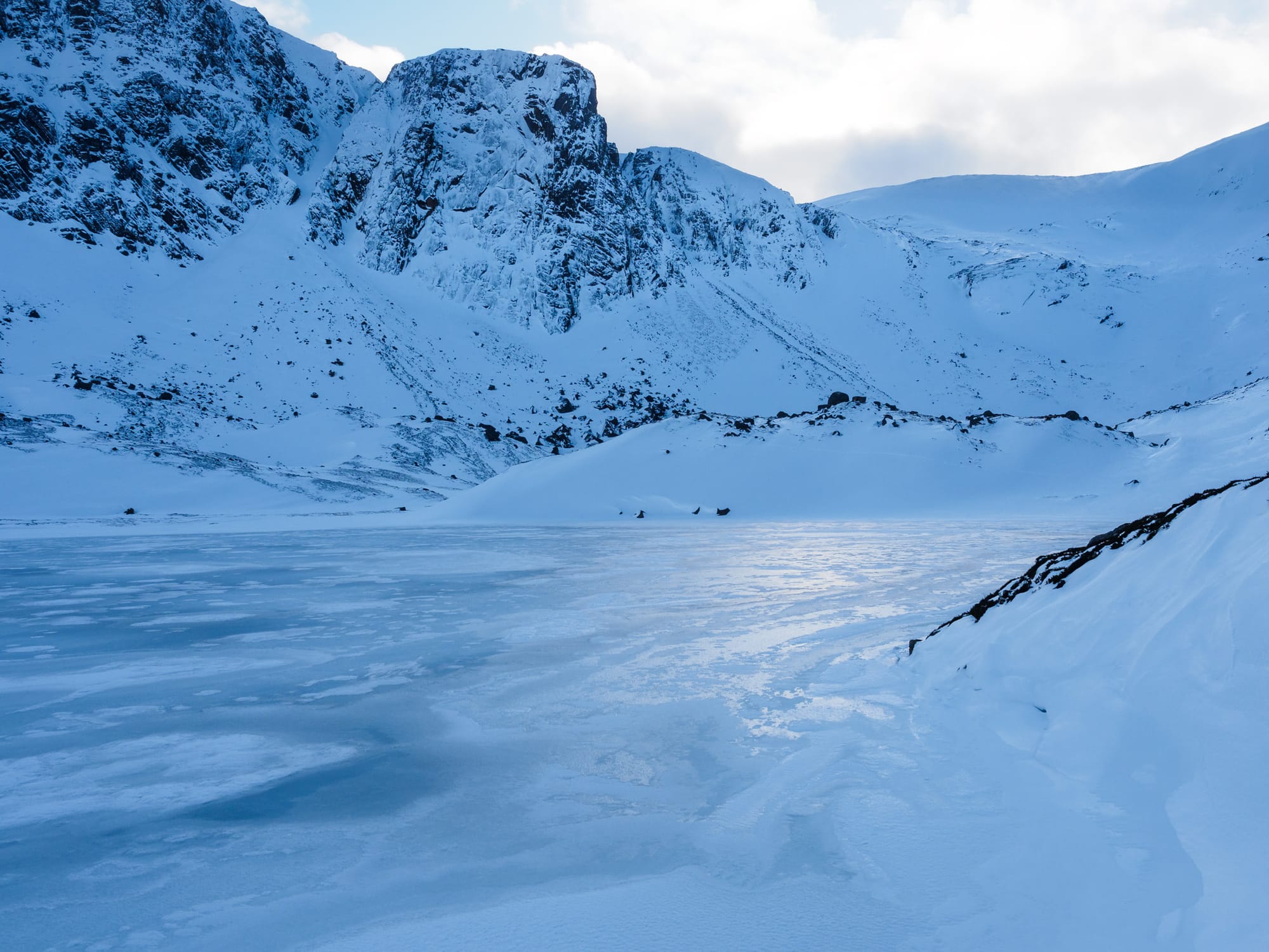My journey alongside the shoreline of Loch A’an, blurred to invisibility by the deep snow banks above and the solid ice below, had been a slow one. I found myself enthralled by the intricate textures and swirls on the ice. The Shelter Stone Crag up ahead, a mountain bastion slashed by the diagonal rift of Castlegates Gully, called me on with its whisper of silence. And the silence in that cathedral-like space was absolute. When finally I paused beneath the mountain wall at the head of the loch, a sanctuary of deep cold and deeper shadow, the rustle of my jacket and the creak of my snowshoes dissipated with astonishing speed – as if quenched by a watchful spirit.