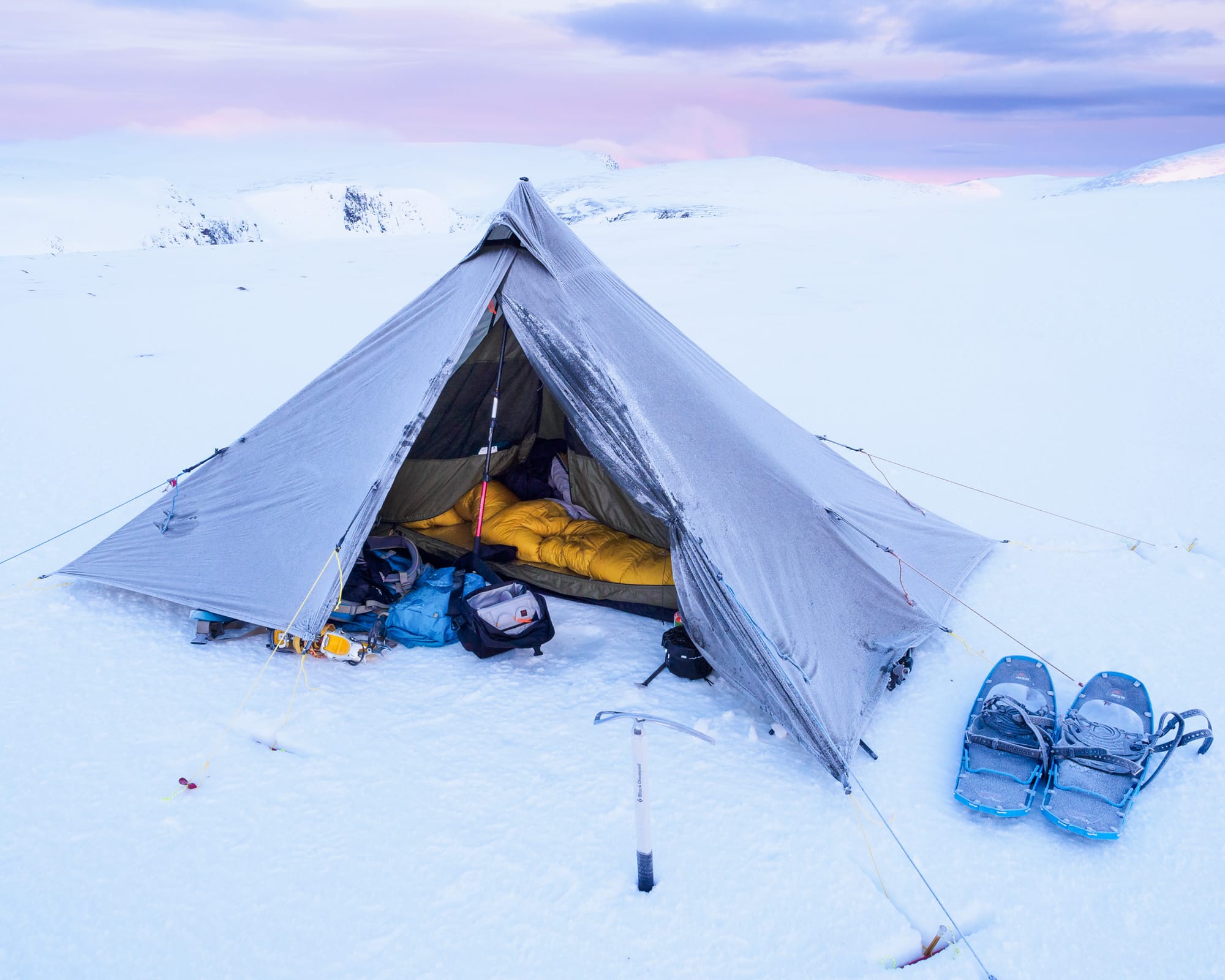 Colour flushed over the landscape as I climbed up to the plateau of Beinn Mheadhoin for the gloaming hour. I had my pick of sites for the tent; the snow was deep, firm and flat almost everywhere, and although I wasn’t expecting high winds I took my time to dig out really good T-slot anchors for my snow stakes. As expected, my body temperature plummeted as soon as I stopped moving. Even putting my down jacket on right away wasn’t enough to cut the chill, and it wasn’t until safely wrapped up in my sleeping bag with a pan full of snow melting on the stove that I started to feel warm again. Frost twinkled on the guylines. The moon was out, shining down between the stars, clear and bright and exquisite.